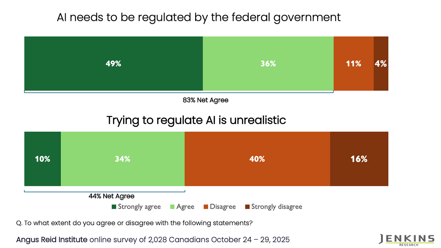 A 2025 Abacus Data study suggests Canadians want a “middle path.” Only 11% trust the tech industry to self-regulate, but only 30% want Canada to have the strictest regulations in the world. The public is looking for “smart regulation” that protects them without stifling the economy.